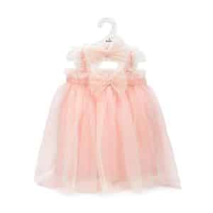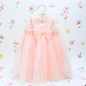 Σε απαλό ροζ χρώμα με αέρινο τούλι διακοσμημένο με λευκά πουά και φιόγκους, χαρίζει γλυκύτητα και στυλ, ιδανικό για βάπτιση ή γιορτινές περιστάσεις.
