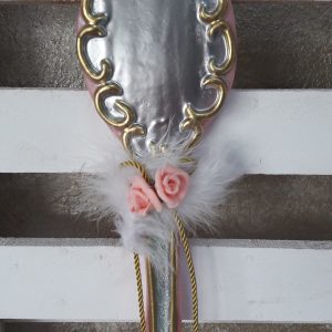 Παχαλινή λαμπάδα, ροζ με χρυσό και ασημί σε σχήμα καθρέπτη διακοσμημένη με λευκά φτερά και ροζ λουλουδάκια.