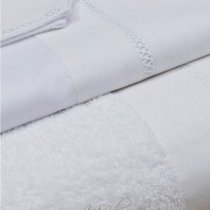 Βαμβακερό σετ λαδόπανου σε λευκό χρώμα με διακοσμητική λινή φάσα και διακριτική τρέσα. Το σετ διαθέτει πιστοποίηση OEKO-TEX STANDARD 100 και αποτελείται από