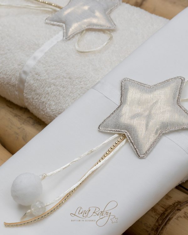 Λαδόπανο από τη Lina Baby διακοσμημένο με κεντημένο απλικέ μεταλιζέ αστεράκι, σε εκρού. Το σετ διαθέτει πιστοποίηση OEKO-TEX STANDARD 100 και αποτελείται από σεντονάκι, εσώρουχα, πετσέτα μεγάλη και μικρή πετσέτα ιερέα: