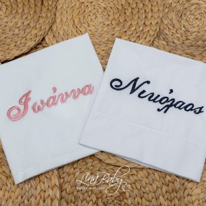 Προσφέρεται η δυνατότητα γραφής του ονόματος του παιδιού με κέντημα στο λαδόπανο και στην πετσέτα, ίδιων αποχρώσεων με το λαδόπανο.