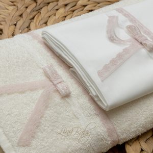 Βαμβακερό σετ λαδόπανου Lina Baby “Claire” σε εκρού χρώμα με διπλή σειρά τρέσα γαλλικής δαντέλας σε εκρού και ροζ και διακοσμητικό φιογκάκι. Το σετ περιλαμβάνει σεντονάκι, εσώρουχα, πετσέτα μεγάλη, μικρή πετσέτα για τον ιερέα και διαθέτει πιστοποίηση OEKO-TEX STANDARD 100.: