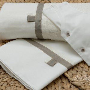 Βαμβακερό σετ λαδόπανου Lina Baby “Liam” σε εκρού χρώμα με φάσα από λινό και διπλή σειρά από διακοσμητικές τρέσες σε εκρού και μπεζ χρώμα. Το σετ περιλαμβάνει σεντονάκι, εσώρουχα, πετσέτα μεγάλη, μικρή πετσέτα για τον ιερέα και διαθέτει πιστοποίηση “OEKO-TEX STANDARD 100”: