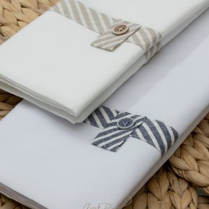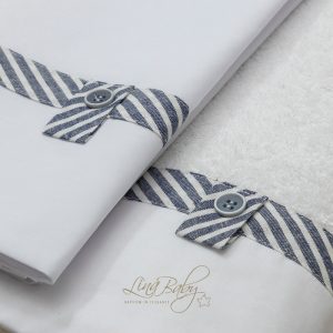 Βαμβακερό σετ λαδόπανου Lina Baby “Dylan” σε λευκό χρώμα με τρέσα από ριγέ διαγωνάλ σχέδιο σε μπλέ-λευκό και μπεζ-εκρού αντίστοιχα και διακοσμητικό κουμπάκι. Το σετ περιλαμβάνει σεντονάκι, εσώρουχα, πετσέτα μεγάλη, μικρή πετσέτα για τον ιερέα και διαθέτει πιστοποίηση OEKO-TEX STANDARD 100: