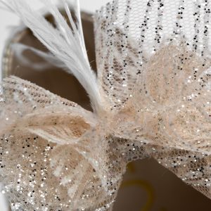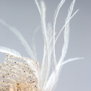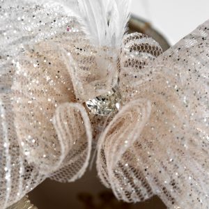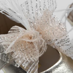 Μπαλαρίνα αγκαλιάς από χρυσό δέρμα και διακόσμηση με σομόν glitter τούλι, στρας και off white φτερά.