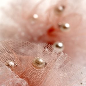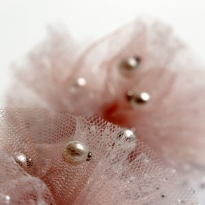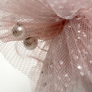 Μπαλαρίνα αγκαλιάς από λευκό δέρμα και διακόσμηση με ροζ glitter τούλι, πέρλες και off white φτερά.