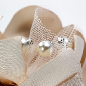 Μπαλαρίνα για τα πρώτα βήματα από εκρού δέρμα διακοσμημένο με λουλούδι από μπεζ σατέν, πέρλες και τούλι.