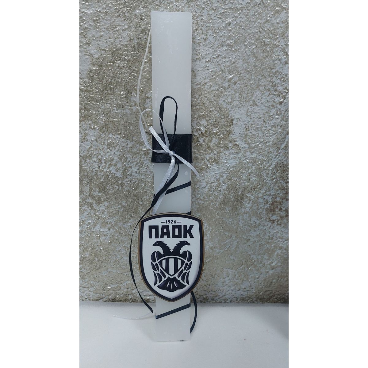 Πασχαλινή λαμπάδα με θέμα τον ΠΑΟΚ, ιδανική για μικρούς και μεγάλους φιλάθλους της ομάδας. Η λαμπάδα είναι σε λευκή απόχρωση και διακοσμείται με το χαρακτηριστικό έμβλημα του ΠΑΟΚ, κορδέλες σε ασπρόμαυρους χρωματισμούς και κομψή χειροποίητη διακόσμηση.