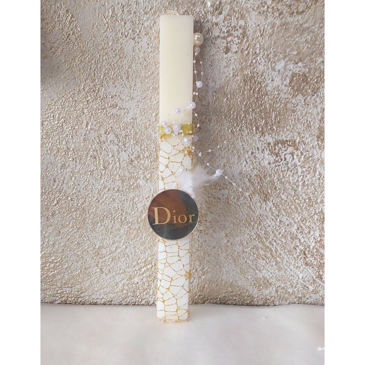 Λαμπάδα τύπου αρωματική,λευκή διακοσμημένη με χρυσό διχτυυωτό ύφασμα,πέρλες και το σήμα Dior.