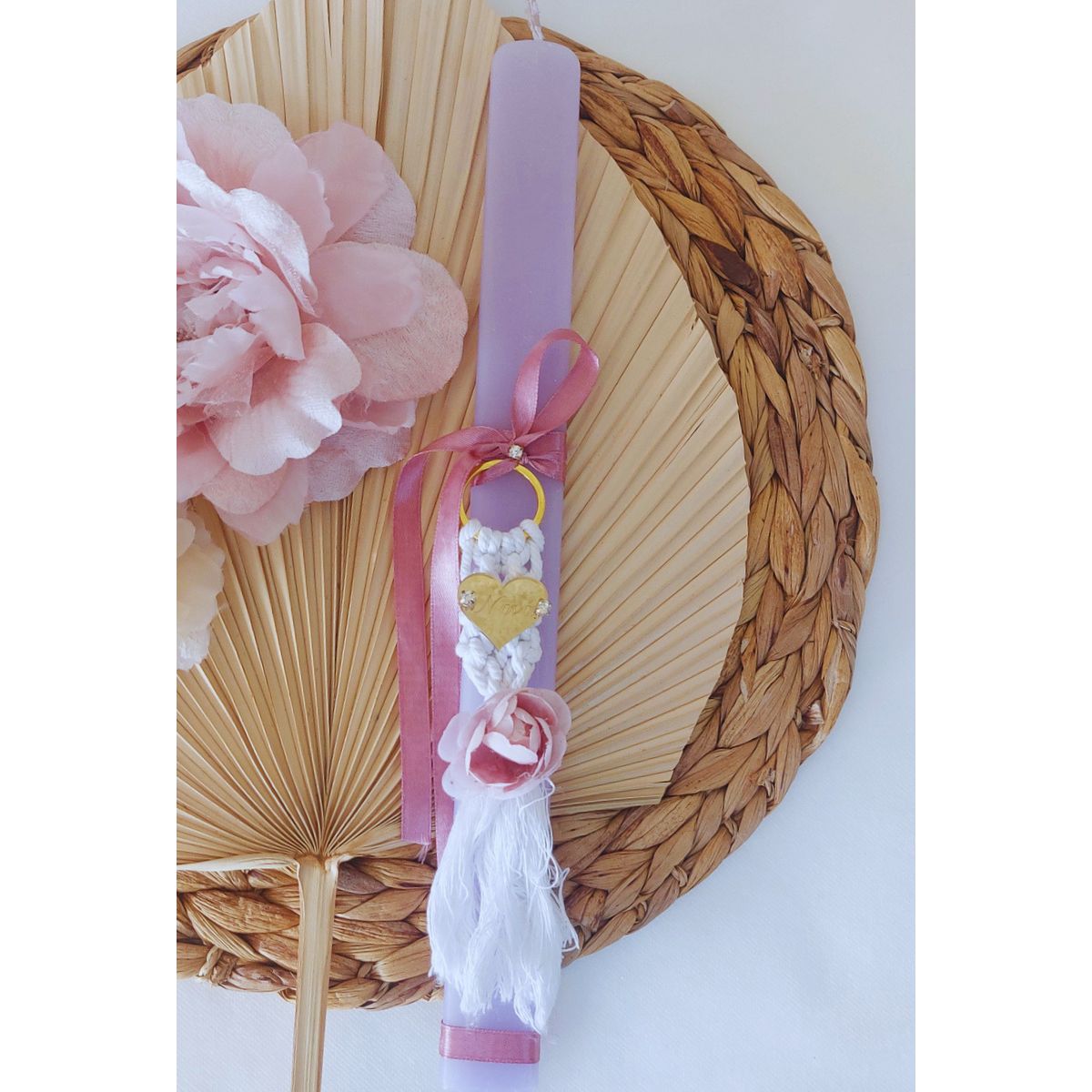 Λαμπάδα αρωματική,ροζ-σομόν διακοσμημένη με μακραμέ μπρελόκ και plexiglass Νύφη